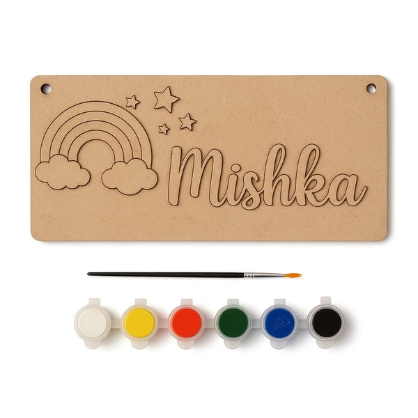 DIY MDF Kit- Designed for easy assembly and maximum fun, this kit is the perfect screen-free activity for makers of all ages. ??Perfect For: Creative Hobbies: A relaxing way to personalize your home decor.??Summer Camps: An engaging, hands-on craft that keeps kids focused and productive.??Child Development: Enhances fine motor skills, color recognition.??Kit Includes:MDF Base DIY kits for kids Nameboards.Base 8*4 Inches - 4mm. Name & cutouts - 2.5mm. Paint, rope to hang & brush .Provide the name to be customised on the checkout page.This kit comes with Tempera colors.??Any theme can be made -For customisation/ bulk order contact us on WhatsApp